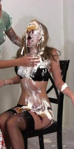 Messymissmia was surprised by MrMuck with a big sloppy cream pie to the face
